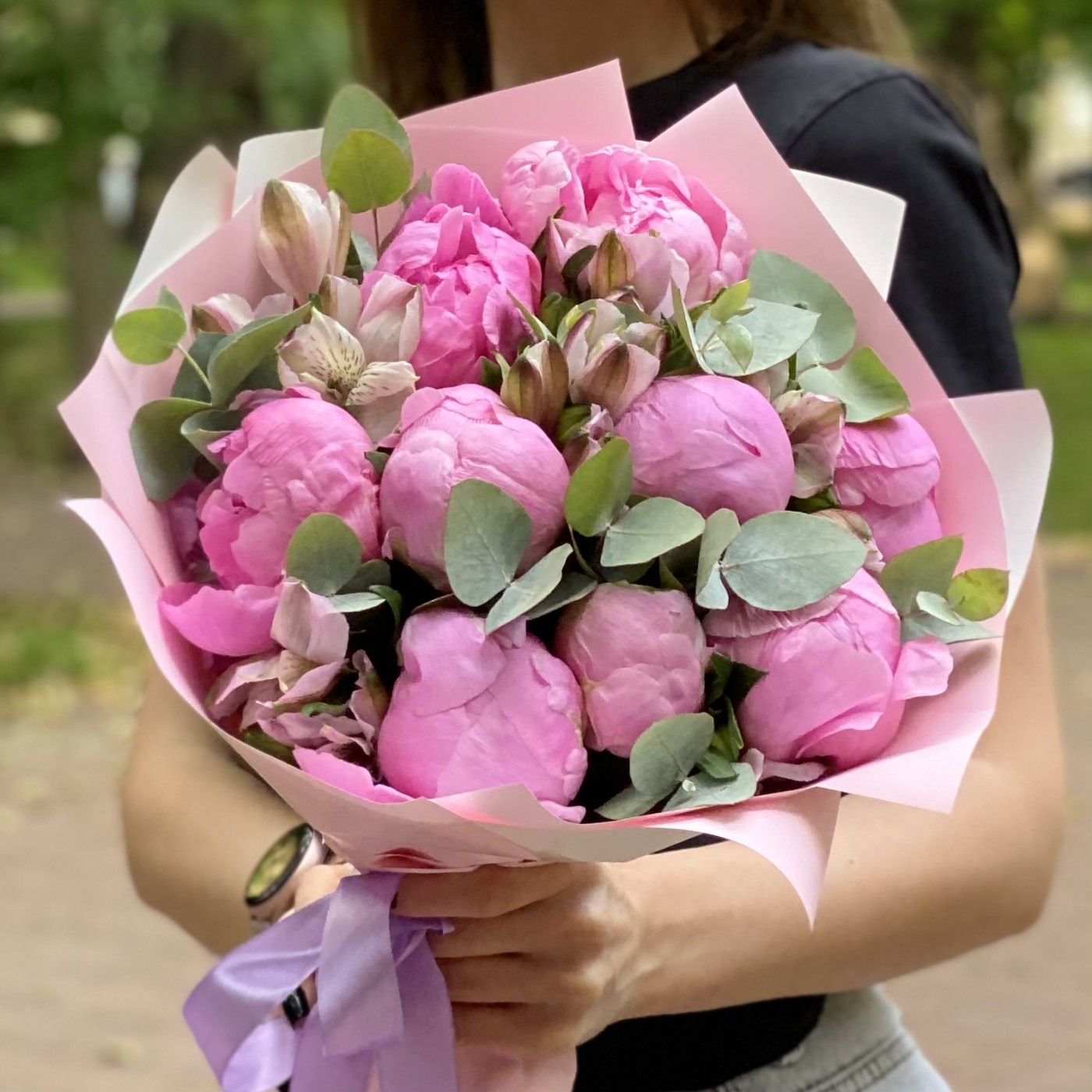Состав: пион - 9 шт, альстромерия 6 шт, фисташка - 2 шт. эвкалипт - 2 шт, упаковка