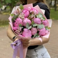 Букет из 9 розовых пионов с альстромериями. Ароматный букет по поводу и без повода принесет радость и душевную гармонию в ваши отношения. Чистая красота свежих и ярких пионов говорят о любви и нежности на языке, понятном каждой девушке.