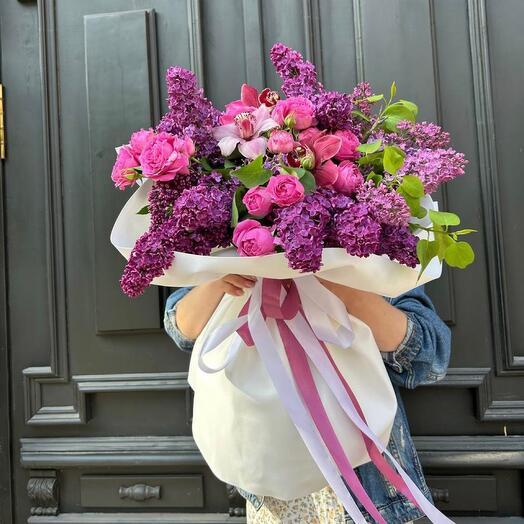 Состав: сирень - 5 шт, кустовая пионовидная роза "Мисти баблс" - 4 шт, бутон орхидеи цимбидиум - 3 шт,