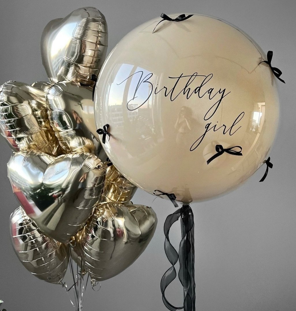 - 1 «стеклянный» шар Баблс 65 см с вашей индивидуальной надписью и бантиками;