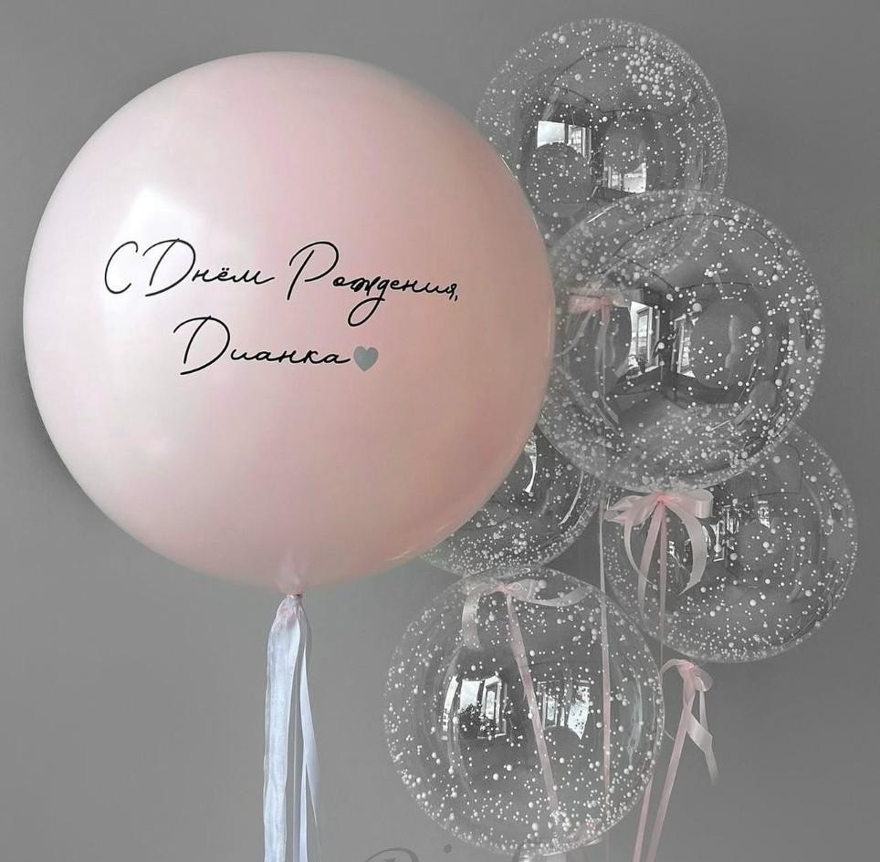 Это утонченная и элегантная декорация, которая идеально подходит для самых трогательных и незабываемых событий. В составе композиции — 1 большой нежно-розовый шар, на котором будет напечатана ваша персональная надпись, что придает каждому моменту особенную индивидуальность. Вдобавок к этому, композицию украшают 5 прозрачных bubbles-шариков (45 см), в которых внутри мягко колышется круглое белое конфетти из пенопласта, создавая эффект легкости и воздушности.