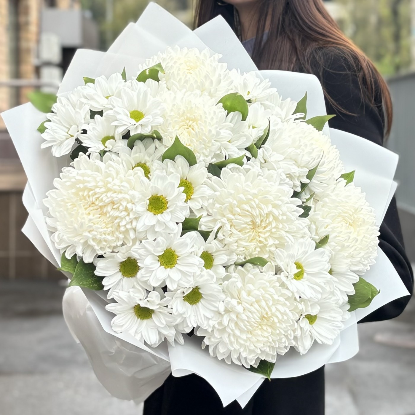 Состав: хризантема одноголовая - 7 шт, хризантема кустовая - 8 шт, рускус - 4 ветки, упаковка