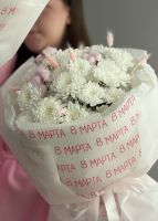 Размер М: кустовая хризантема Алтай - 3 ветки, хлопок - 2 шт, лагурус - 8 шт, тематическая упаковка