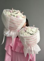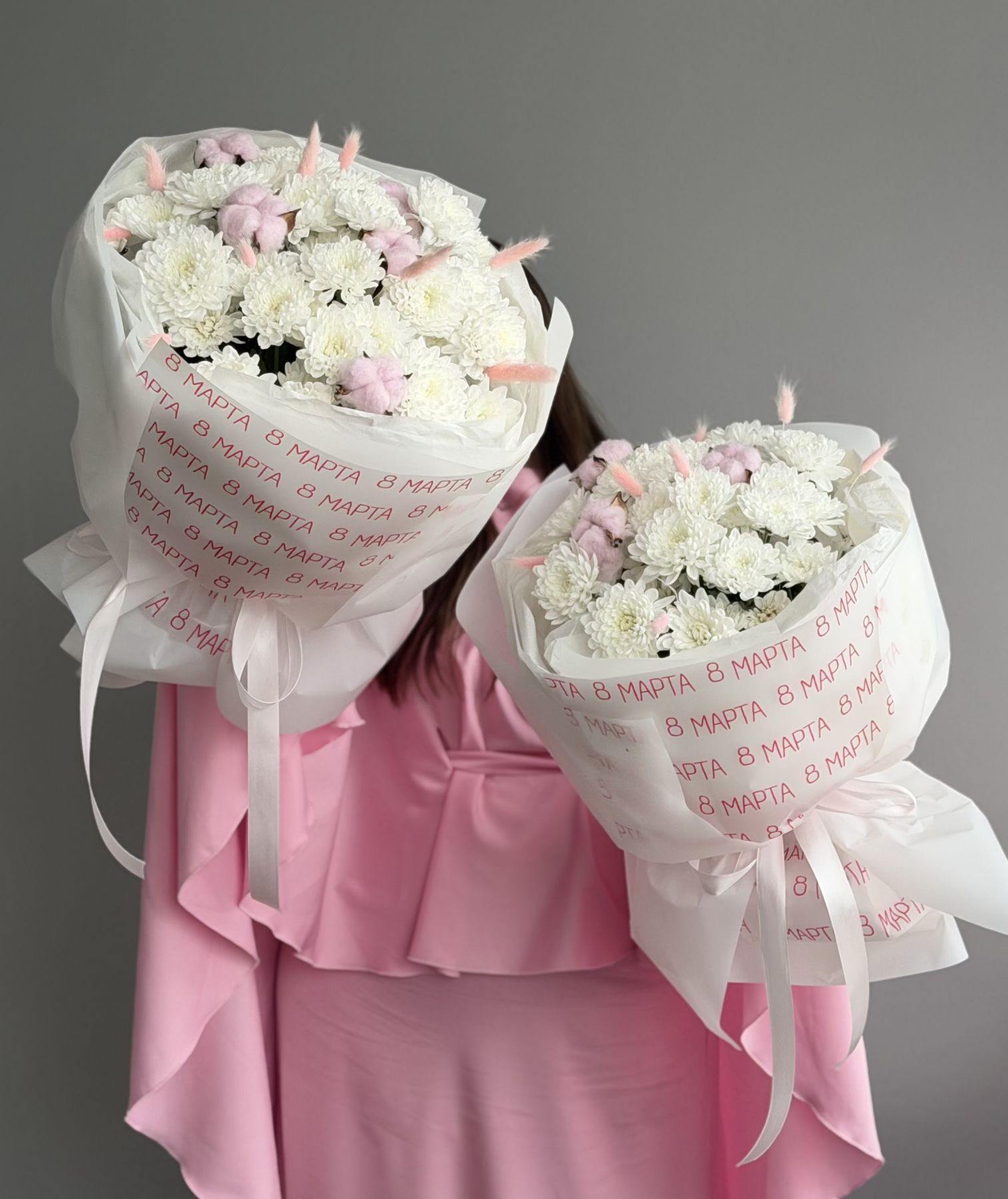 Размер L: кустовая хирзантема Алтай - 5 веток, хлопок - 5 шт, лагурус - 8 шт, тематическая упаковка
