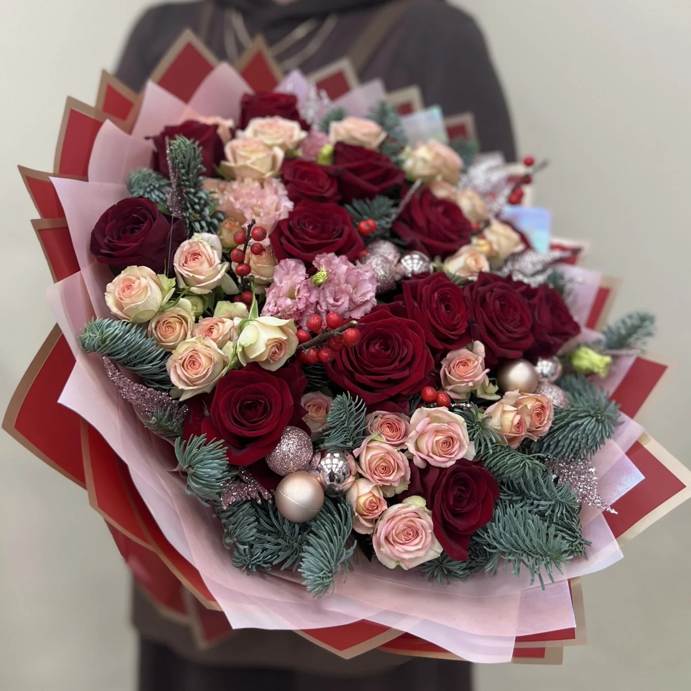 Состав: роза красная 50 см - 15 шт, роза кустовая - 7 шт, лизиантус - 2 шт, нобилис - 1 ветка, новогодний декор, упаковка