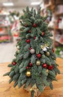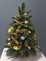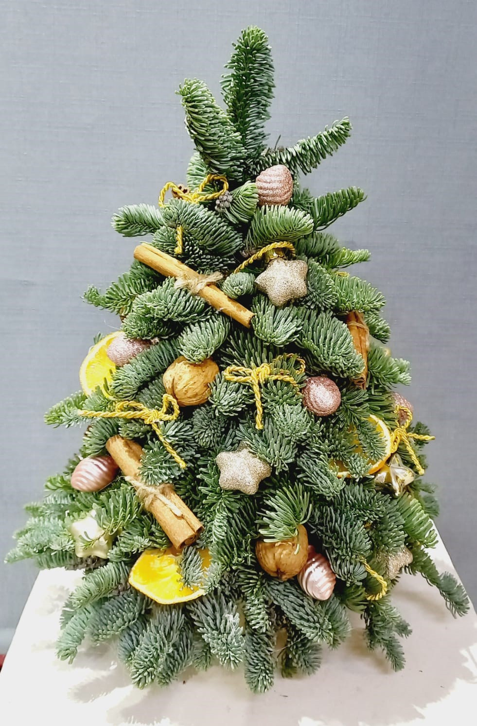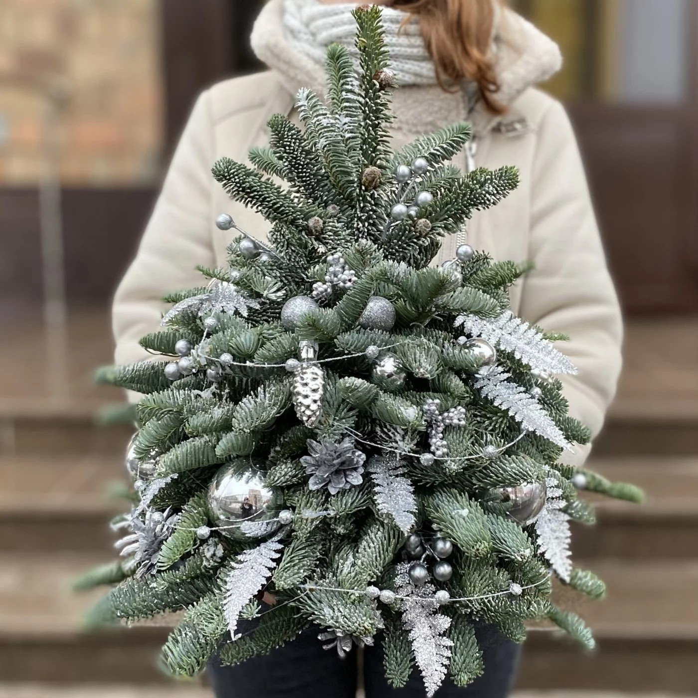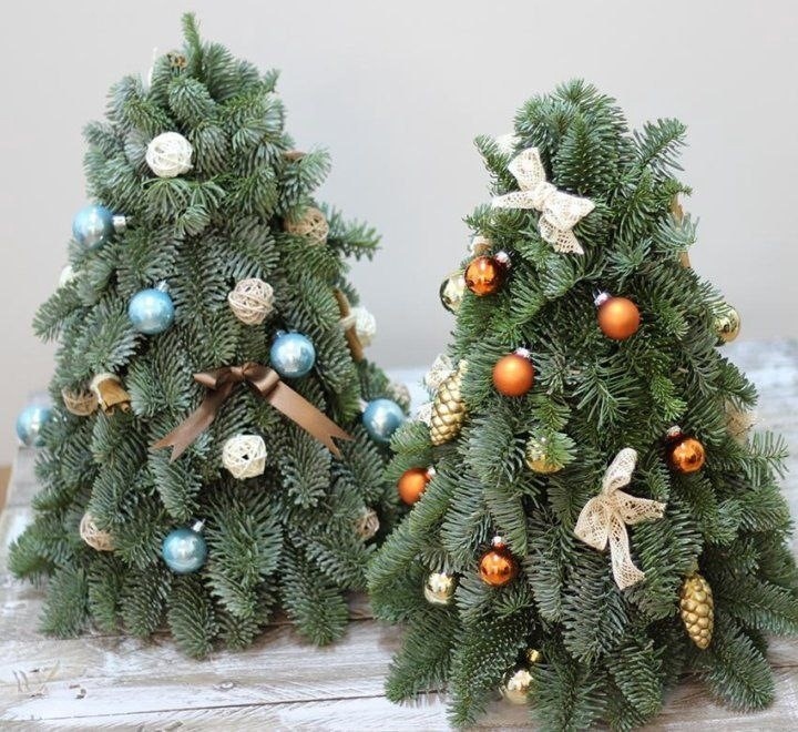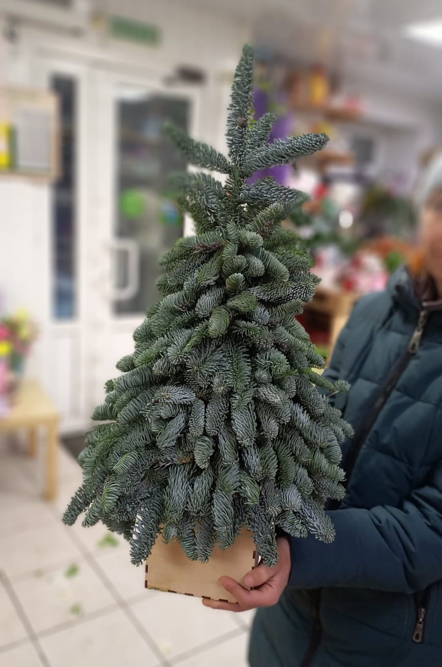 В наших салонах можно заказать елочки из нобилиса. На фото примеры елочек и декора.