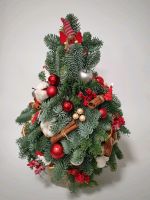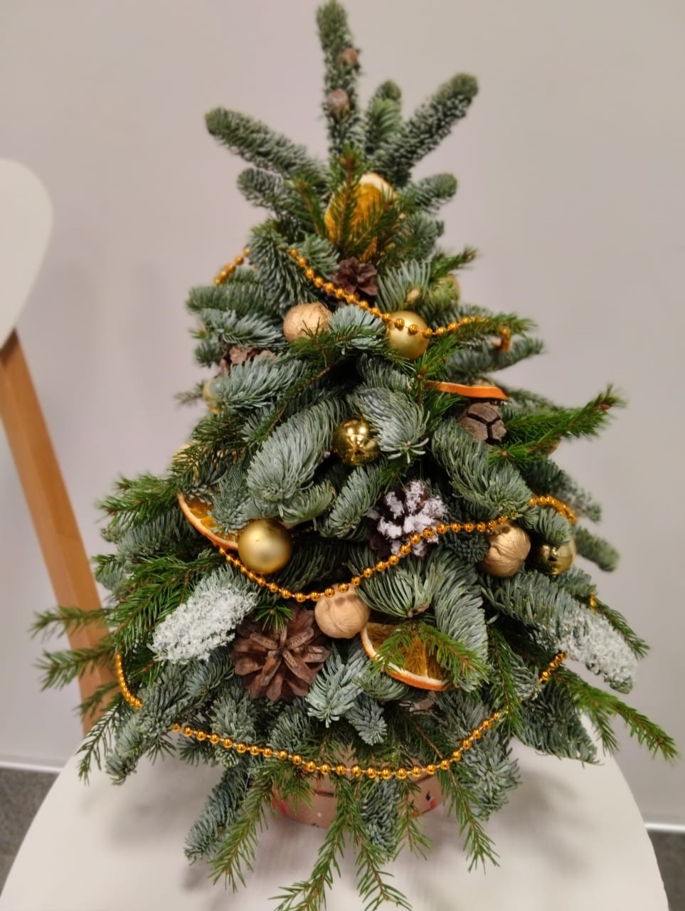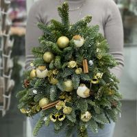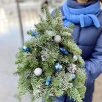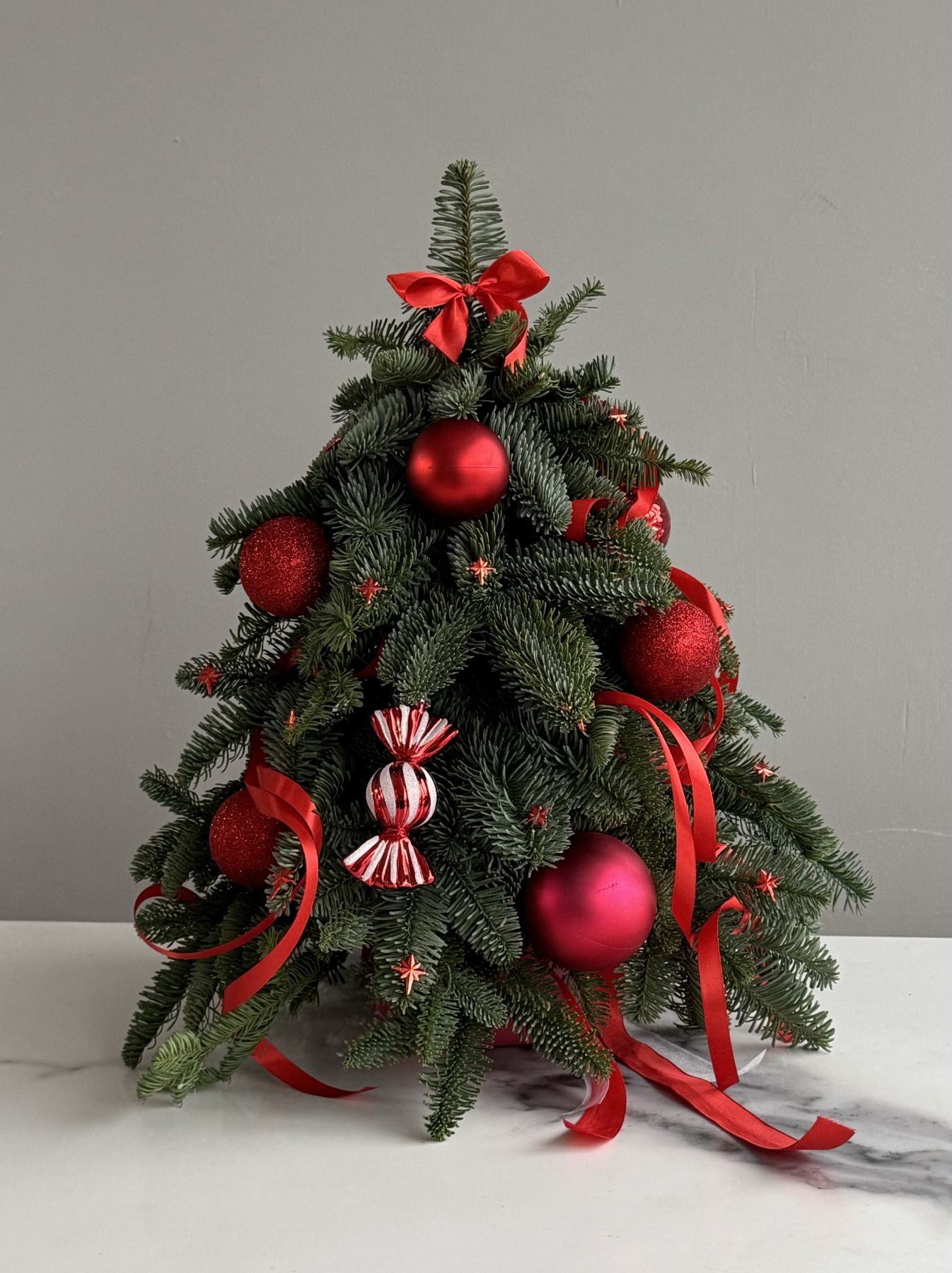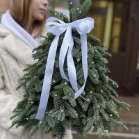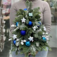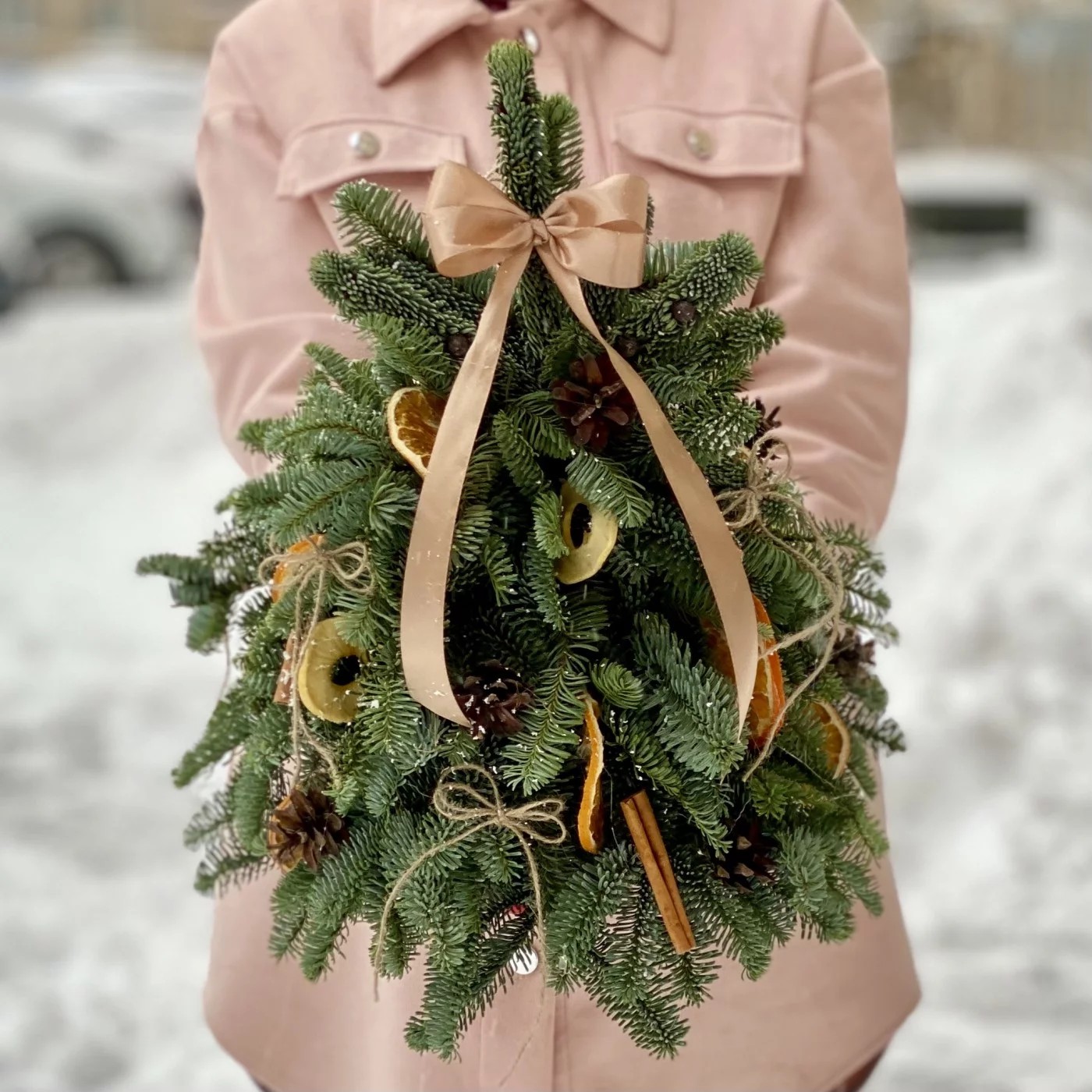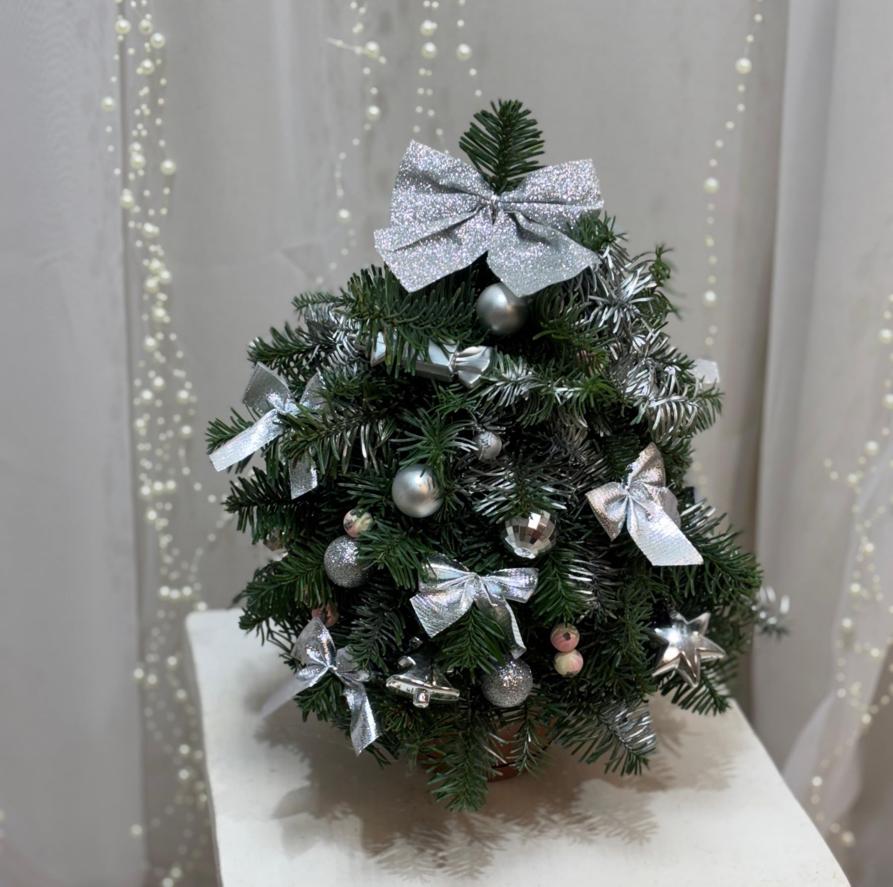 В наших салонах можно заказать елочки из нобилиса. На фото примеры елочек и декора.