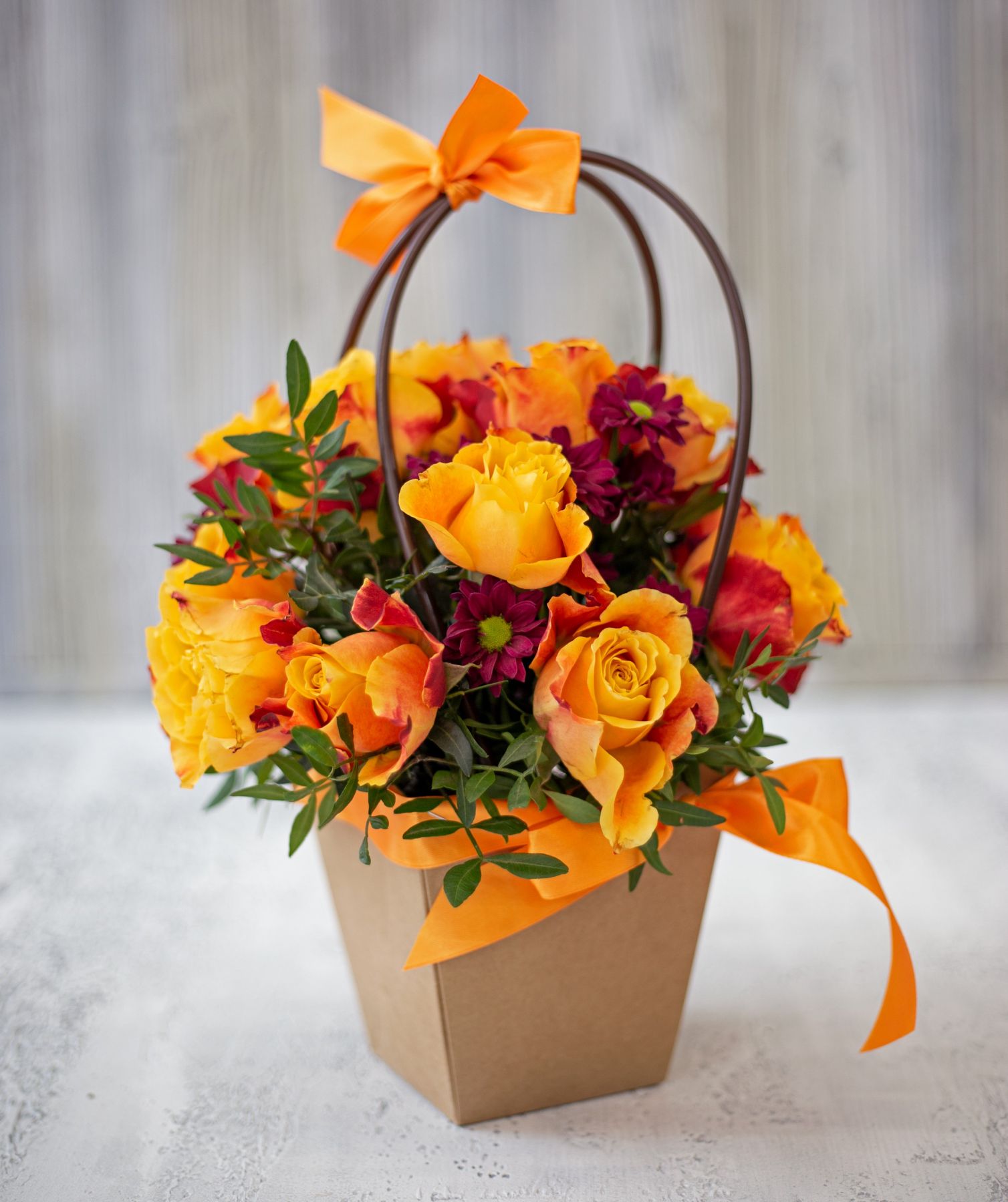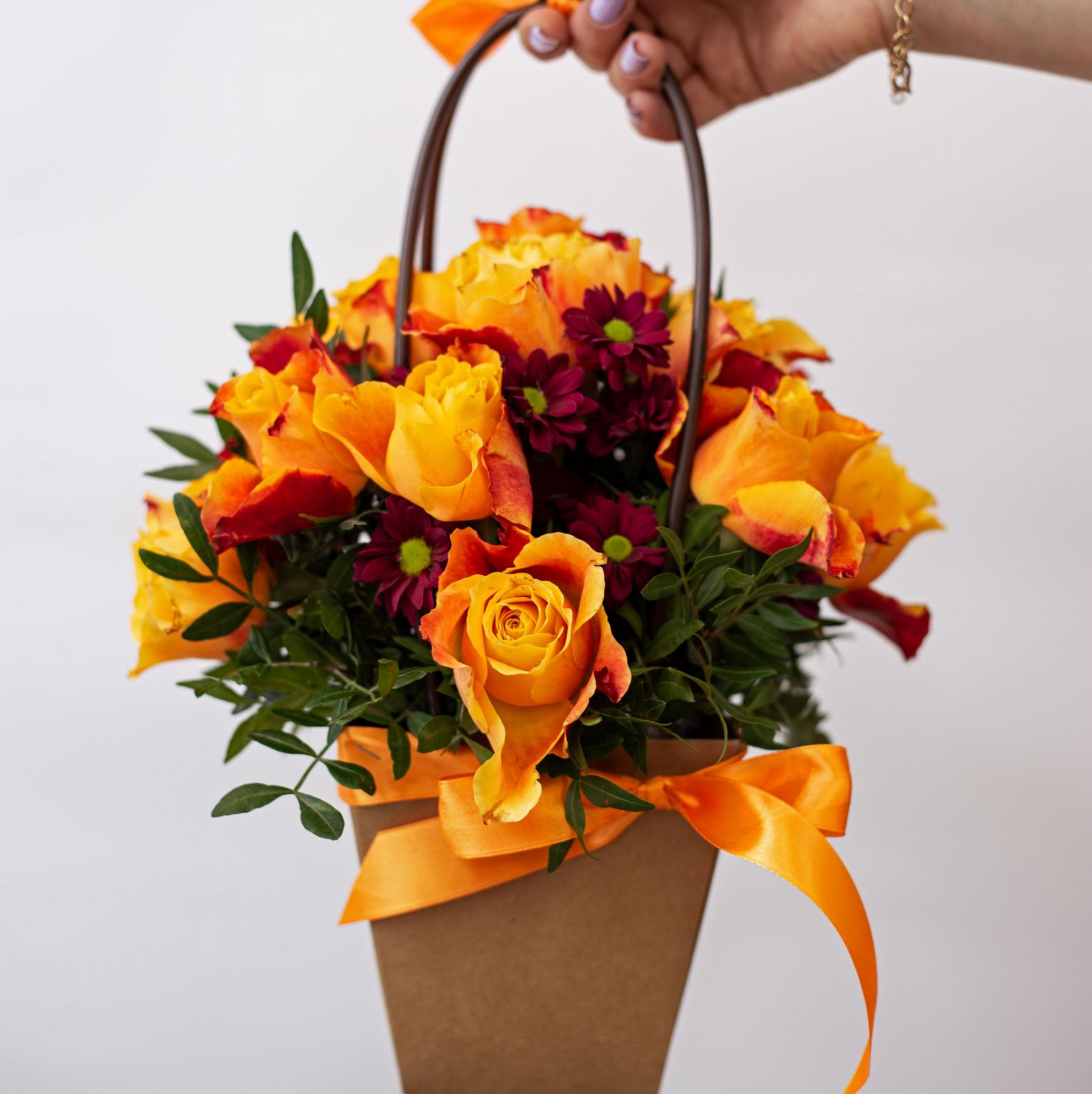Состав: роза оранжевая - 19 шт, хзинатема сантини - 2 шт. фисташка - 2 ветки, сумочка, оазис, тишью, ленты