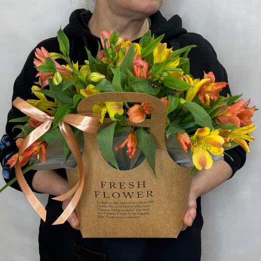 Состав: альстромерии - 11 шт, фисташка - 2 ветки, сумочка, оазис