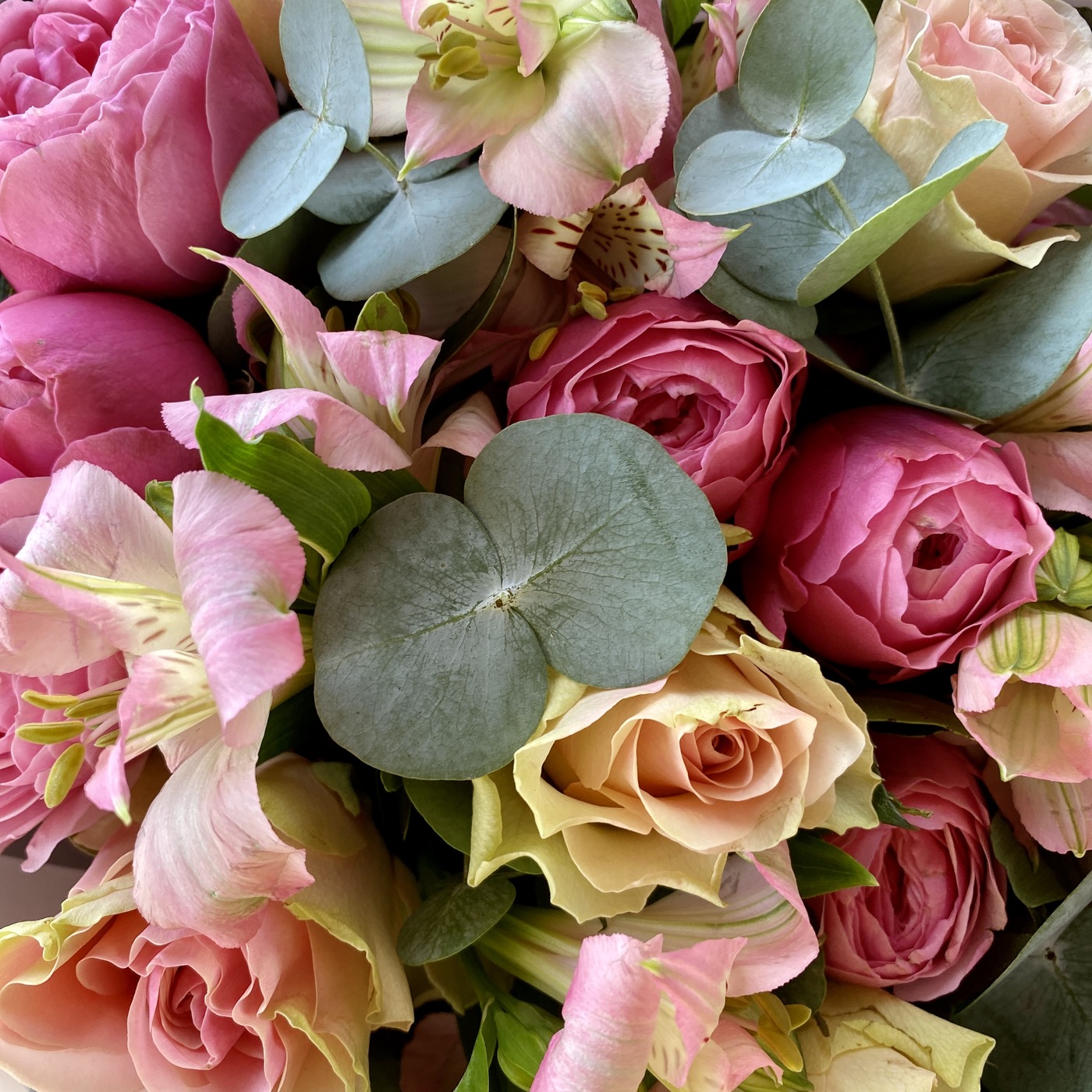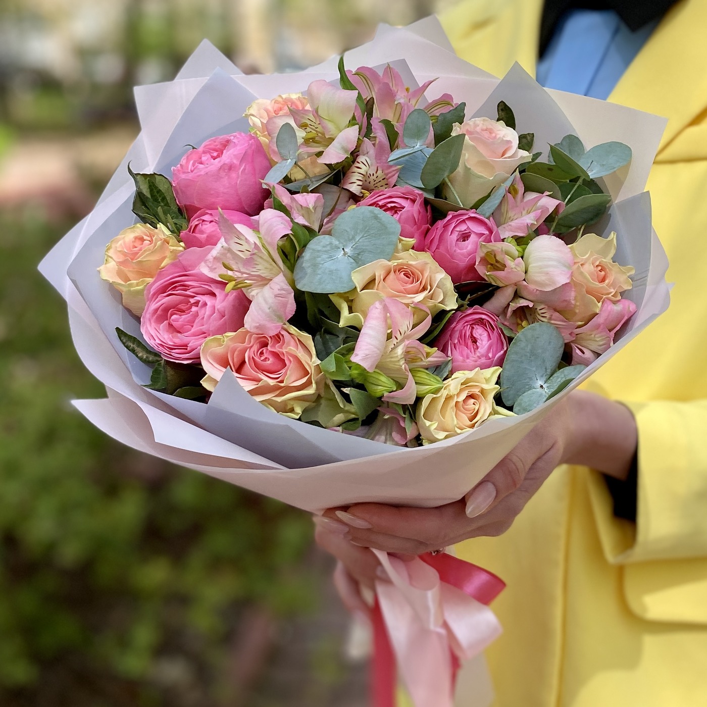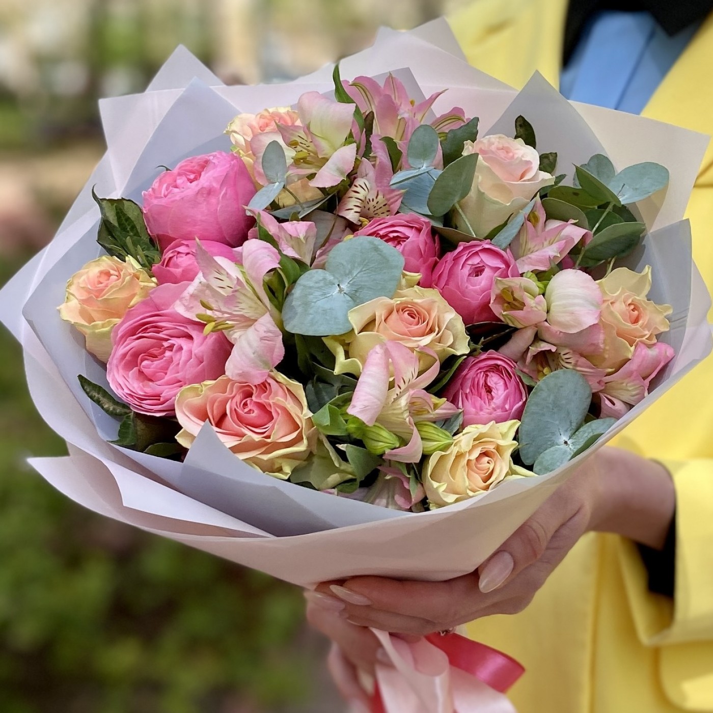 Состав: роза нежно-розовая - 7 шт, роза кустовая пионовидная Сильва Пинк - 2 шт, альстромерия - 3 шт, эвкалипт - 2 шт, фисташка - 2 шт, упаковка