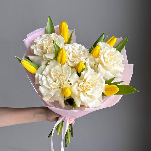 Состав: роза мондиаль французская - 5 шт, тюльпан - 8 шт, упаковка